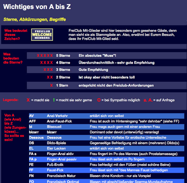 Nur geprüfte Adressen mit Bildern, Kontaktdaten, Berichten und der zuverlässigen Freiclub-Bewertung. Klare Erklärungen aller Abkürzungen.